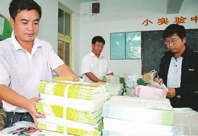 8月29日,在山东省博兴县曹王镇中心小学,教职员工整理刚刚运抵学校的免费教科书。当日,山东省博兴县价值290多万元的免费教科书和各种教辅用书运抵该县70多所农村中小学校。新华社发(陈彬 摄)