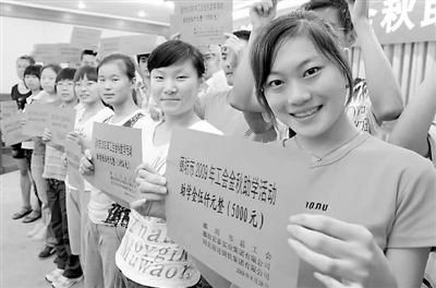 8月28日上午,在河北省廊坊市总工会举办的2009年工会“金秋助学”受助仪式上,该市今年考入大学的特困职工、农民工子女中的20名优秀学生代表高兴地领取了5000元的助学金。廊坊市总工会从2005年至今已救助特困职工和特困农民工子女302人,发放助学金达80余万元。本报记者 张宪 本报通讯员 李德明 摄