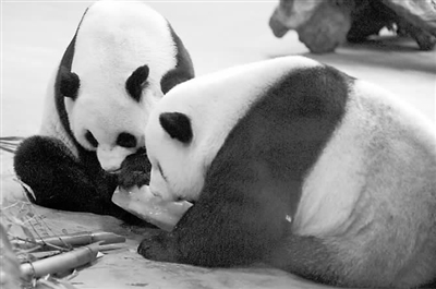 8月30日,“圆圆”(左)过生日,“团团”(右)也跟着沾光,一起分享蛋糕。