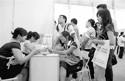 8月30日,四川制药股份有限公司在招聘会上招聘员工。成都2009年秋季特大型人才招聘会暨高校毕业生供需洽谈会于8月29日在成都新会展中心开幕。为期2天的招聘会共有672家用人单位进场招聘,提供岗位1.6万个。新华社记者 陈燮 摄