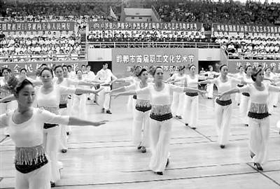 8月28日,历时一个月的河北省邯郸市首届职工文化艺术节开幕。艺术节设有职工健排舞、业余歌手、时装展示、《祖国在我心中》演讲、书画摄影、乒乓球赛等6项大赛,参与职工达30万人。邯郸市总经常开展多种形式的职工文化艺术活动,相当多的企业文化艺术活动也开展得有声有色。图为开幕式上职工的健排舞表演引来观众的喝彩。