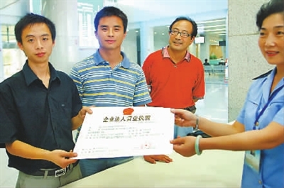 9月2日,杨立俊(左一)、李涛(左二)从合肥市工商局工作人员手中接过营业执照。