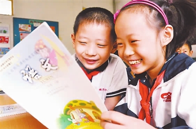 9月1日,山东滨州市滨城区第四小学一年级学生张博雅(右)和尹宇航(左)在教室里阅读新领到的免费教科书。