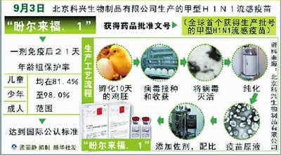 北京科兴生物制品有限公司董事、总经理尹卫东透露,北京科兴的甲型H1N1流感疫苗月产量可达200万至300万人份,在今年国庆前,预计可以生产出500万人份的疫苗,以满足北京市乃至国家的储备需求。