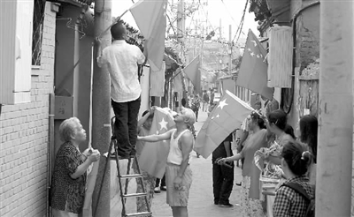 9月3日,北京大栅栏地区胡同居民在院门口挂国旗。据悉,为迎接新中国成立60周年,大栅栏地区2000多个院和近千个单位将升挂国旗3000多面。郭新 摄