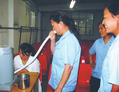 近日,山东丰源煤电股份有限公司赵坡煤矿工会组织113名在职、离退休女职工在滕州市卫生防疫站接受了一个季度一次的妇女专项例行体检。图为该矿女工正在进行肺活量测量。任伟摄