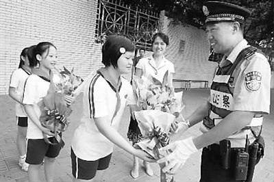 9月1日,福州市乌山小学的学生代表将鲜花献给校门口绿色通道上执勤的巡警及交通协管队员,感谢他们9年来为全校师生保道路安全畅通所付出的艰辛。 新华社记者 姜克红 摄