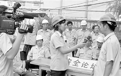 9月7日,在安徽淮北矿业集团铁运处烈山电务段机电工区,节目主持人正在与职工就安全问题进行现场访谈。今年以来,铁运处针对煤炭市场行情,提出“安全就是效益”的口号,先后在矿区铁路电视台和广播电台开辟了“安全论坛”、“安全直通车”、“安全论坛进班组”等系列栏目,使安全理念深入职工和家属心中。