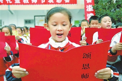 9月8日,山东省枣庄市市中区实验小学的学生在朗诵集体创作的诗歌“颂恩师”。在该校当日开展的“千名小学生颂恩师”活动中,1000多名学生通过给老师朗诵诗歌、献红花、佩戴红领巾等活动,表达对老师的感恩之情,祝愿辛勤工作的老师们教师节快乐。