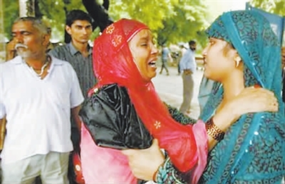 9月10日早晨,印度首都新德里一所公立学校发生踩踏事件,造成5名学生死亡,31名学生受伤,其中5人伤势严重。图为两位学生家长在事故现场相互安慰。肖劼 供图