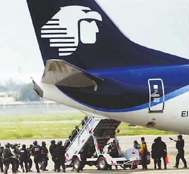 2009年9月9日,一架从墨西哥坎昆市飞抵首都墨西哥城的波音737客机遭到劫持,目前机上104名乘客和全部机组成员均被释放,警方已将9名劫机嫌疑人逮捕。图为全副武装的墨西哥警察强行登上遭劫持的客机。