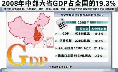 中部崛起战略实施以来,中部地区的经济规模和市场份额快速提升。2008年河南、湖南、湖北三省GDP已经超过万亿元,在全国13个GDP过万亿元的省区市中,中部占据三席。面对国际金融危机,2008年,中部各省GDP增速大都高于全国9%的平均增速,保持了较平稳的发展态势。与此同时,社会消费品零售总额、进出口总额、财政收入等反映区域竞争力综合绩效的关键指标,增幅均高于全国平均水平。
