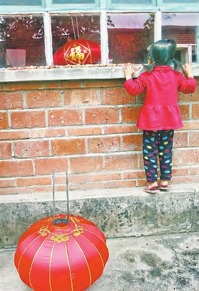 9月16日,北京“灯笼第一村”红庙村,一家灯笼专业户的孩子翘首看着妈妈在屋内制作灯笼。
