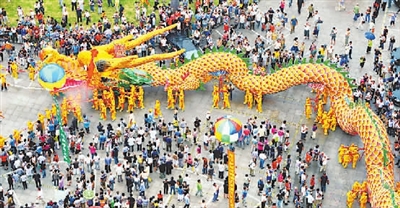据了解,“巨龙”总长80米,龙身高6.2米,龙头直径5米。每个部分都饰以精美的民间绘画图案。梁臻摄