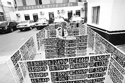 9月11日,在徐州市鼓楼交巡警大队大院里,民警孙中兴在布置假车牌展架,准备供市民参观,学习识别假车牌。9月9日,江苏省徐州市以鼓楼交巡警大队三中队民警孙中兴的名字命名的“孙中兴查缉假牌假证工作室”正式挂牌成立。从2004年至今,孙中兴共查获假牌2500余副、假证600多个、盗抢车辆32辆。 新华社发