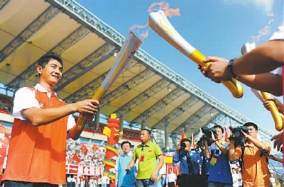 9月21日,奥运冠军邢傲伟(左)点燃第二棒火炬手的火炬。当日,第十一届全国运动会火炬传递活动在山东省烟台市举行。