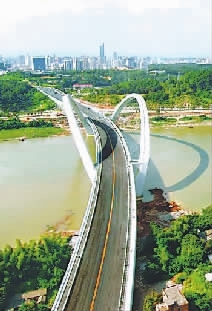 本报讯 世界首座大跨径曲线梁非对称外倾拱桥——南宁大桥建成通车仪式9月21日上午在“绿城”南宁隆重举行。南宁市委书记车荣福表示,作为市政府的重点工程,南宁大桥既是南宁市实现“重点向南,加快五象新区建设,再造一个新南宁”战略布局的重要桥梁,也是推进北部湾经济区发展、建设区域性国际城市的交通枢纽。