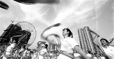 9月22日,湖南省长沙市天心区66个社区的3000多名市民齐聚新世纪体育广场,参加“祝福祖国”健身舞会,庆祝新中国成立六十周年。其中,60名1949年出生的老人身穿红衣、肩披黄色绶带在舞会上领舞。新华社记者 赵众志 摄