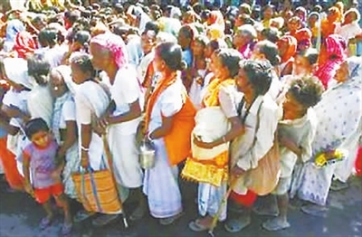 9月25日,当印度教最大的宗教节日杜尔加女神节即将到来之际,在印度东北边平原上的古城西里古里,当地贫民们正在排队领取由当地慈善组织捐助的衣物。谢涛 供图