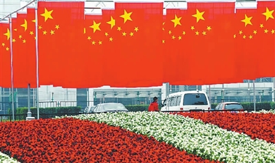 这是北京海淀公园东门国旗“旗阵”(9月27日摄)。