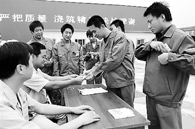 9月19日上午,(天)津秦(皇岛)铁路客运专线施工现场,中铁电化局西铁工程公司津秦客专项目部的两名会计,正在给农民工发放当月的工资和过节奖金。国庆节临近,西铁工程公司对农民工工资的发放情况进行细致排查,并对发现的问题逐个清理。与此同时,该公司还筹集资金用于改善农民工食宿条件,丰富农民工业余文化生活。马丰红 摄