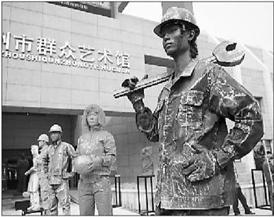 9月28日,一场表现钢铁、煤矿、石油、铁路等劳动者形象的真人雕塑秀,在郑州市群众艺术馆广场上演。当日,由河南省美协、郑州市委宣传部、郑州市文化局主办的庆祝中华人民共和国成立60周年《英雄赞歌》——中原雕塑展隆重开幕。 向明超 摄