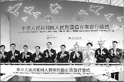 9月28日,中央政府60亿元人民币国债开始在香港公开发行,这是中央政府首次在内地以外地区发行人民币国债。这是嘉宾在发行仪式上。 新华社记者 吕小炜 摄