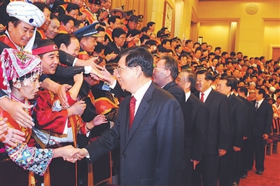 在热烈的掌声中,胡锦涛发表了重要讲话。他首先代表党中央、国务院向受到表彰的模范集体和模范个人表示热烈的祝贺,向为我国民族团结进步事业作出贡献的广大干部群众和社会各界人士、向民族工作战线的同志们致以崇高的敬意,向关心支持我国民族团结进步事业的香港特别行政区同胞、澳门特别行政区同胞、台湾同胞以及海外华侨华人表示衷心的感谢。