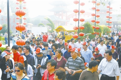 10月2日,众多游客在河南省开封市清明上河园参观。
