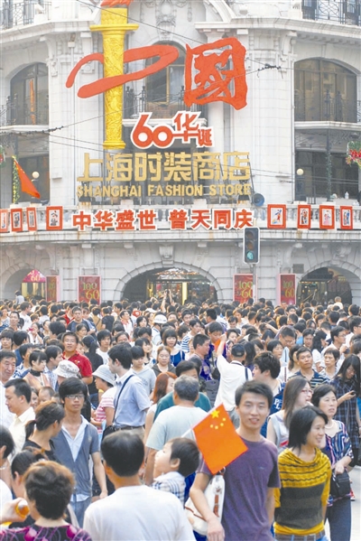 10月2日,国旗飘扬的南京路步行街人头攒动。当日,上海天气放晴,迎来黄金周旅游高峰,国旗飘扬的南京路步行街人流如织,到处洋溢着喜庆的节日气息。新华社发 朱岚 摄
