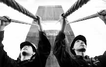 为向新中国60华诞献厚礼,曾在安徽淮北矿业孙疃矿新井建设中推出“提前进行主井永久性装备、解放主井生产力”革新施工方案、为矿上缩短建井工期4个月、节省资金投入500余万元的张新全(左)和黄福祥,国庆前夕又瞄上了绞车房验绳技改,这对被职工称为技改拍档的哥俩正卯足劲进行最后一搏。王新平 刘玉保 摄