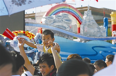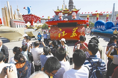 国庆彩车犹如一个个浓缩的中国地理,吸引游客不停地驻足合影。