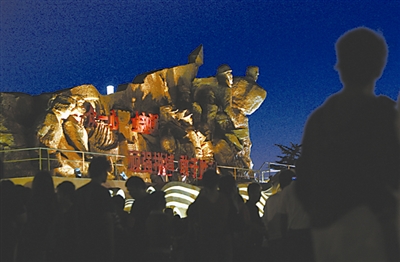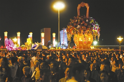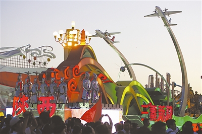 夜幕里,彩车上的雕塑在灯光的映照下格外雄伟。