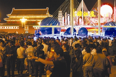 10月2日,国庆大典中亮相的彩车在天安门广场与群众见面。为了近距离一睹彩车的风采,记者于10月2日8点多钟就赶往天安门广场,但在还有一公里左右的地方人就越来越多了,看来大家都想先睹为快。