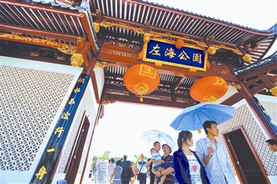 10月6日,游人从新建成的福州左海公园大门走出。