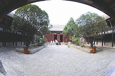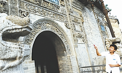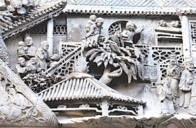 “文革”期间为保护这些砖雕艺术当地百姓用泥巴糊住砖雕才得以保护,让游客们清楚地欣赏到花戏楼巧夺天工的雕刻艺术。(图四)