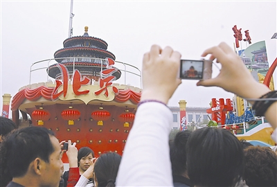10月11日,不少游客在闻知国庆彩车将在当天晚上撤离天安门广场时,扎堆前来观看拍照,使得广场上的游客人数猛增。当天是彩车展示的最后一天,彩车夜景仍将开放至22时,随后进行彩车撤离工作。为了不影响交通,60辆彩车的撤离工作将连夜进行,计划用7个小时,在周一凌晨5时前全部撤离完毕,在朝阳体育中心“待命”。其中,外省彩车将陆续返回“家乡”。肖亮 摄