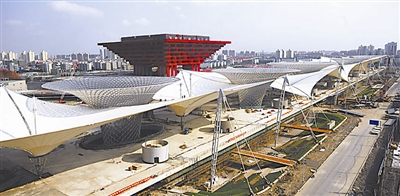 10月10日拍摄的正在进行精装修的上海世博轴。