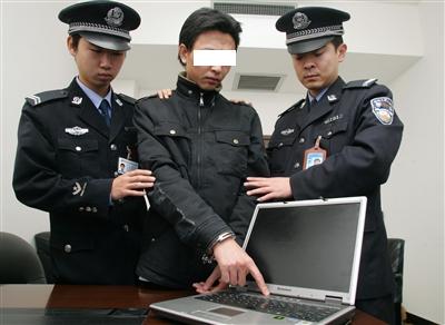 图为扮演“黑客”,利用高科技在“网上银行”盗窃温州客商10万元的犯罪嫌疑人张韫指认犯罪工具和物品。CFP供稿