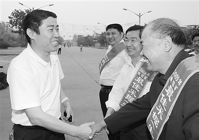 10月8日,安徽淮北矿业桃园煤矿矿长周茂春(左)欢送该矿最佳采掘(生产)能手外出观光旅游。今年上半年,该矿在采掘一线和井下辅助单位开展“最佳采掘(生产)能手”评选活动,根据职工总收入、出勤率和是否发生“三违”等指标评选出33名 “最佳采掘(生产)能手”,并获得免费外出旅游机会。陈敏奎 摄