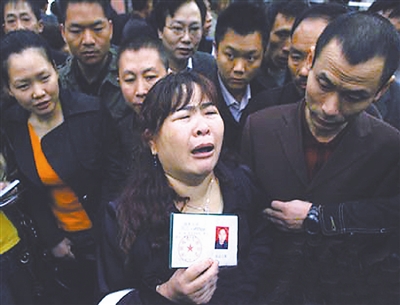 10月14日上午9时30分,备受关注的重庆女“黑老大”谢才萍案在重庆第五中级人民法院开庭审理。庭外,被害人家属哭着前来听审判。 柴魏 摄