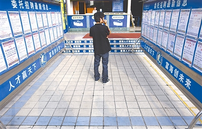 图为10月13日下午,惠州富海人才门外,一名男子驻步察看张贴板上的各类招聘信息。 陈伟斌 摄