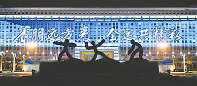 第十一届全国运动会将于10月16日在山东省济南市奥体中心体育场开幕,济南“全运”氛围渐浓。这是在奥体中心体育场旁的龙奥大厦上,以灯光打出巨幅全运标语为济南增添了新景观(10月13日摄)。
