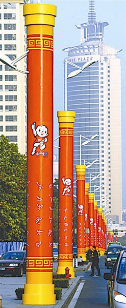 近日,一百三十根带有十一运会设计元素的“全运柱”亮相青岛街头(十月十四日摄)。  新华社记者 李紫恒 摄