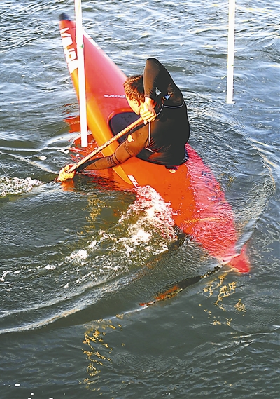 10月14日,一名男子划艇激流回旋选手在练习绕标。全运会日照赛区设有赛艇、皮划艇(静水和激流回旋)、帆船、帆板等项目,将产生40枚金牌。