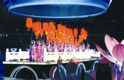 “兰陵美酒郁金香,玉碗盛来琥珀光”,随着一幅幅展示齐鲁雄浑、孔孟遗风、荷柳碧影和全民全运的影像被投射在“碗”状帷幕上,分别名为《紫气东来》、《齐鲁魂》、《和谐风》和《祖国颂》的文艺演出串联起《和谐盛世齐鲁情》的迷人画卷。光影变动,虚实相映,如梦如幻……