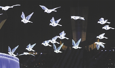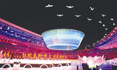 经过运动员入场、升国旗唱国歌等仪式后,本届全运会的开幕式文艺演出终于拉开大幕——随着现场灯光逐渐暗下,50只布满LED灯、散发着幽蓝荧光的“和平鸽”模型从体育场的环形顶棚徐徐降落,翩然而至。这些 “和平鸽”汇聚到场地中心,慢慢展翅起飞,一只直径约有50米的巨型“碗”状帷幕从地面上缓缓升起,悬空而置……