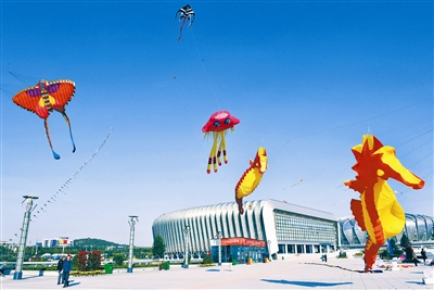 10月17日,80多名来自潍坊的风筝艺人和风筝爱好者在济南奥体中心广场放飞风筝。五彩斑斓的潍坊风筝,将济南奥体中心的上空装扮得多姿多彩,向十一届全运会的八方来客展示潍坊独特的风筝文化。 本报记者 许之丰 摄