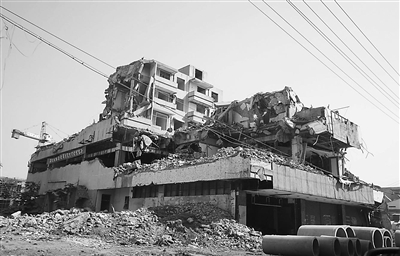 画面中的安徽巢湖“最牛”歌舞厅令人叹为观止。据了解,该市人民路步行街改造工程3年前启动,3年之后,所有的拆迁户都迁走了,惟独这座歌舞厅像一座城中“碉堡”,至今“拔”不掉。据了解,有时仍有歌声从这座掩在一片废墟中的“碉堡”里传出。倪民 摄