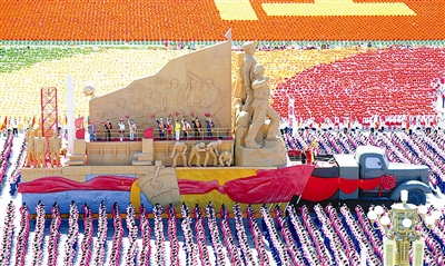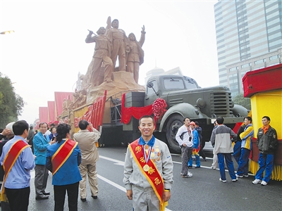 10月1日,在庆祝国庆60周年阅兵式之后,由10万各界群众、60辆彩车组成的36个方阵依次通过天安门广场。中国第一汽车集团公司工人王洪军站在“艰苦创业”彩车上接受国家领导人的检阅。他说,作为一名一线工人,能代表新一代知识型劳模参加国庆60周年庆典,心情非常激动,也充分感受到了国家对一线工人的关心和重视。